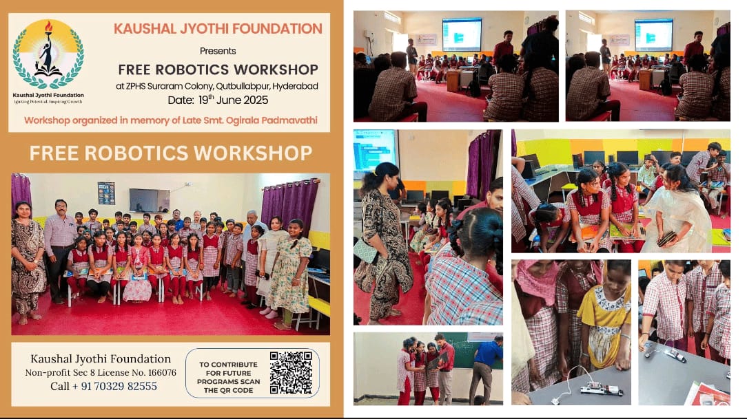 As part of the Kaushal Rural Development Initiative, Kaushal Jyothi Foundation conducted its third free Robotics Workshop at ZPHS Mallampet, Hyderabad, with the aim of bringing quality STEM education to rural and semi-rural communities.