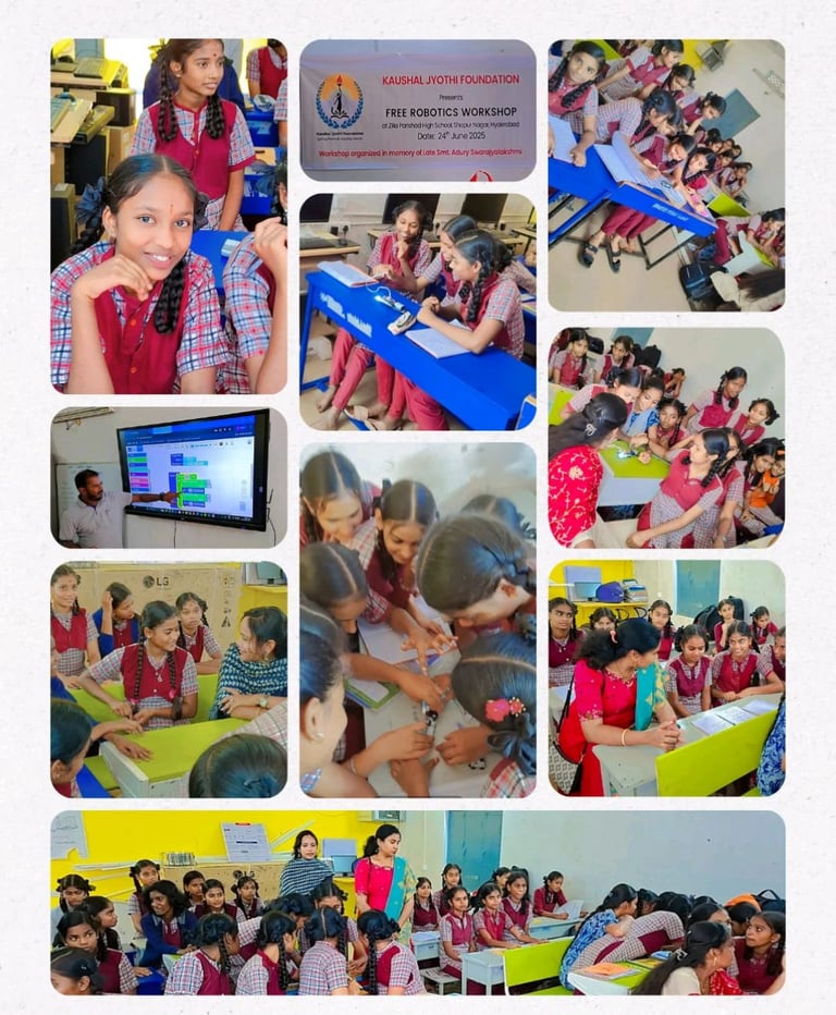Under the Kaushal STEM Shiksha initiative, Kaushal Jyothi Foundation conducted its second free Robotics Workshop at Zila Parishad High School (ZPHS), Shapur Nagar, Hyderabad. The workshop introduced students to the basics of robotics and automation through practical, activity-based learning.